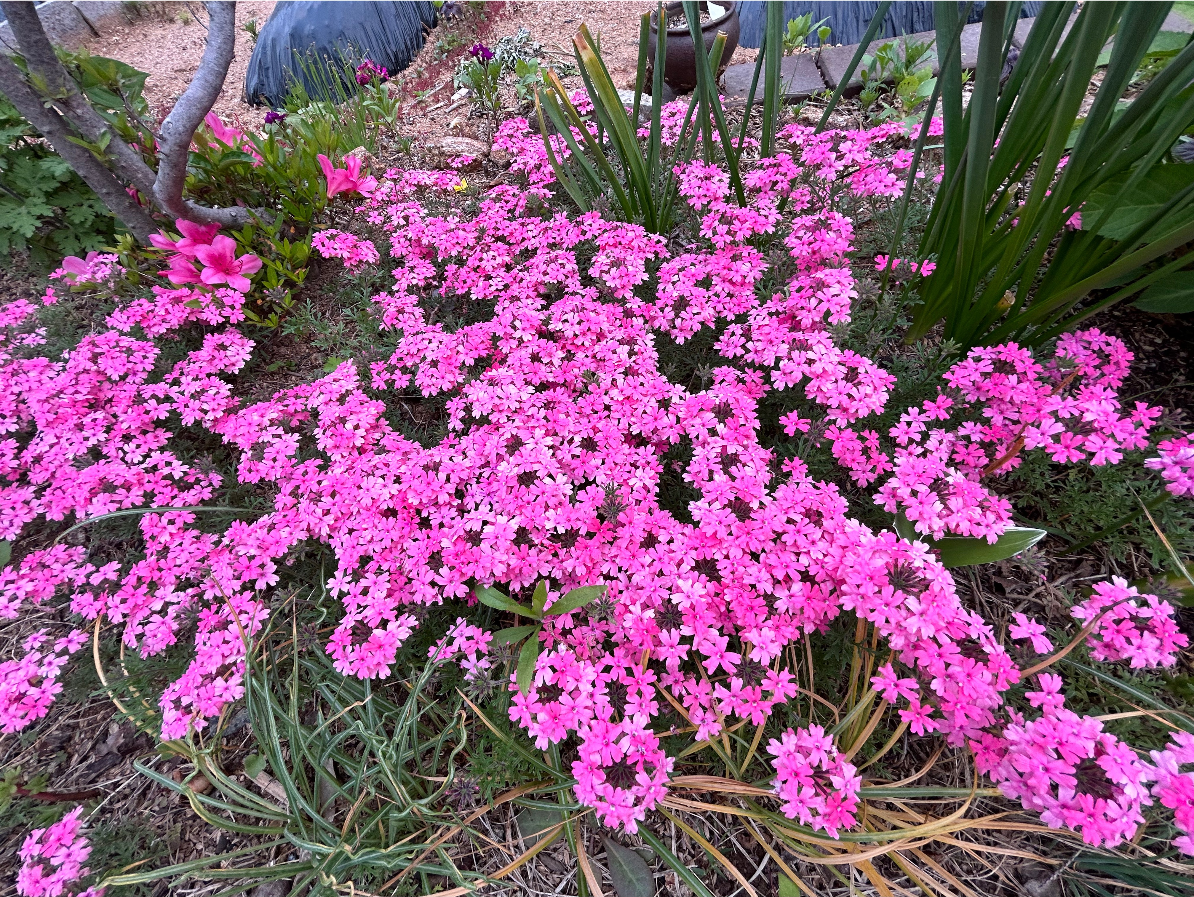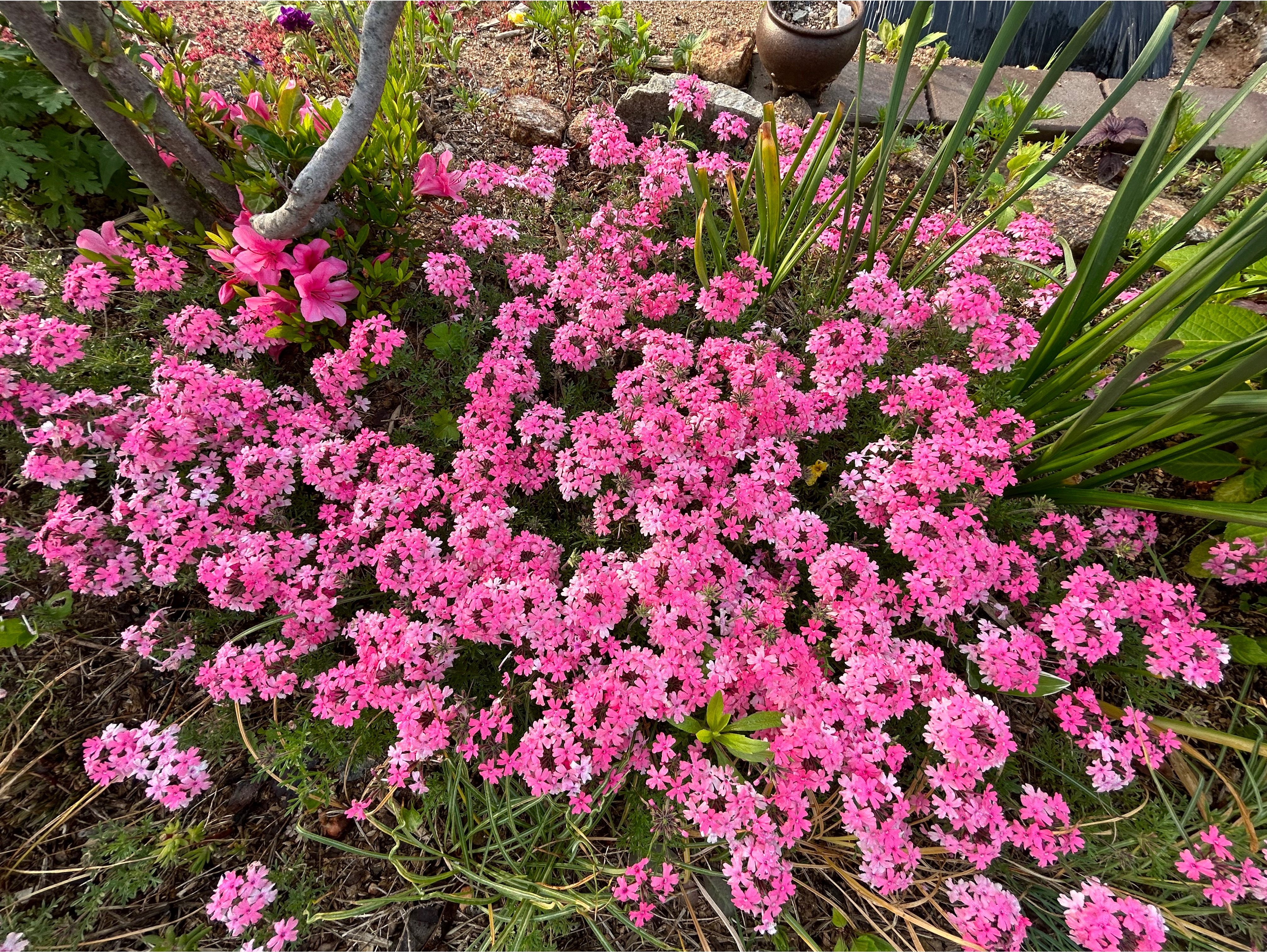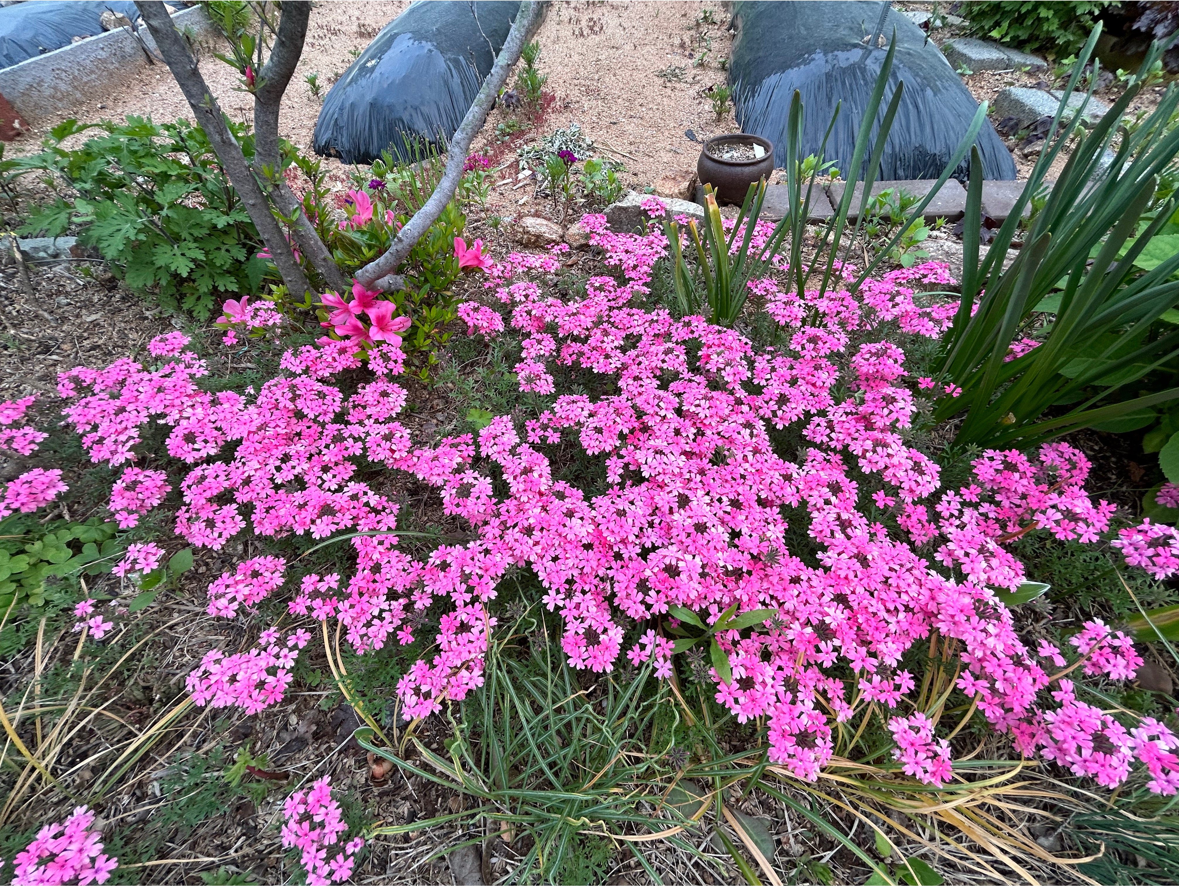 화려한 1년생 버베나와는 다르게 잎이 가늘고 땅으로 기며 꽃피는 다년생버베나는 노지월동후 봄부터 줄기차게 꽃을 피워댄다. 삽목해서 키운게 해묵으니 포기가 커졌다.